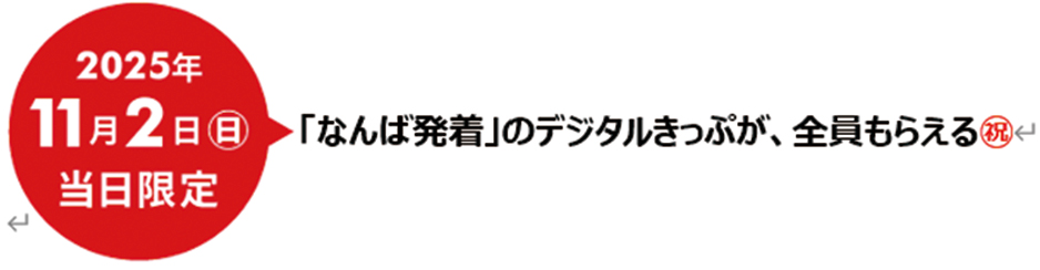 エントリーページよりお申込みいただくと、もれなく全員に2025年11月2日(日)限定の 「なんば発着」デジタルきっぷをプレゼントします!