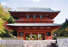 朱に染まる大門に美しいコントラストを添えるあじさい。山深い高野山に咲くあじさいは、7月~ 8月でも楽しめます。<見ごろ:7月末~8月>