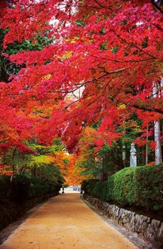 高野山の紅葉といえば、ここ蛇腹路は必見です。爽やかな秋風を感じながら歩く、美しい紅葉のトンネル。郷愁と情緒あふれる「和の美観」をお楽しみください。<見ごろ:10月下旬~11月上旬>