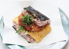 おむすびカツサンドの紀州南高梅500円(テイクアウト限定)。ヒレカツにかかった梅ソースと大葉が夏にもぴったりなさわやかさ。