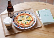 画像1枚目:読書をしながら、フジマル醸造所プロデュースの軽食やお酒も楽しめる。濃厚トマトソースのピザマルゲリータ 850円、Petit Petit 2019 (白泡330ml)2,400円、コーヒー 350円〜。