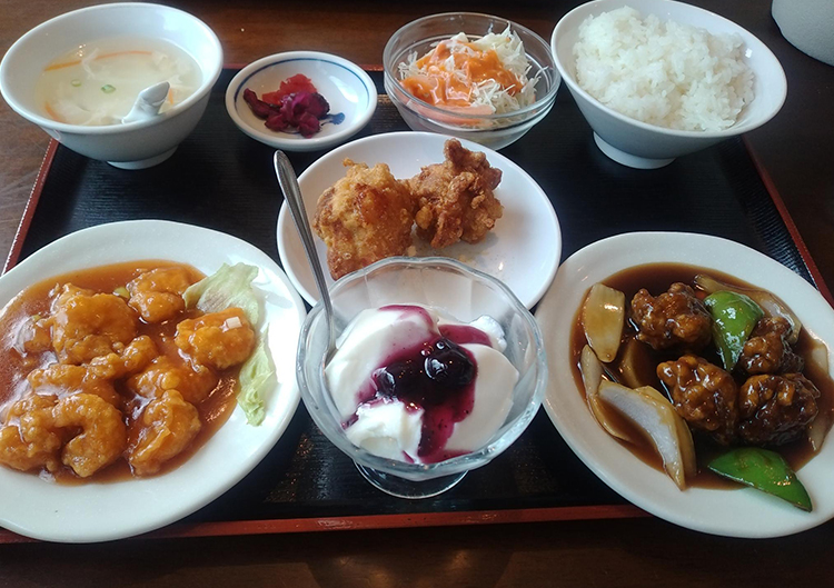 「B定食」は、一品でも十分おかずとなる「エビチリ」・「酢豚」・「唐揚げ」3品にご飯・スープ・サラダ・漬物さらにデザートの「杏仁豆腐」がセットになった大人の贅沢なランチです。自分へのご褒美にご賞味あれ。