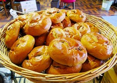 真田六文銭ソファでゆっくり焼き立てパンを楽しんで。
