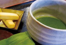 <笹巻あんぷ> よもぎを混ぜた麩であんを包んだお菓子。生麩独特の風味が特徴です。