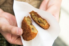 昔ながらの精肉店は地元の食卓の味方 昭和52年創業の精肉店。地元客だけではなく、はるばる遠方からも訪れるファンのお目当ては、オーダーしてからパン粉を付けて揚げる カツなどの揚げ物。人気のコロッケは塩コショウのみの味付けで、牛肉の甘みがしっかり。