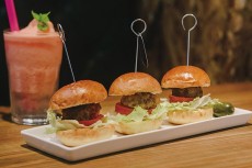 夜カフェ使いもできる大人の隠れ家 カフェ利用もOKな人気のバー。山椒を忍ばせたバーガーをはじめ、フルーツを丸ごと用いたドリンクなど、どれもユニークなセンスが光る。2階にはテーブル席があり、リラックスした時間が過ごせる。