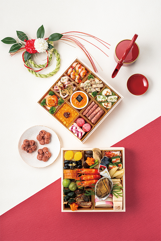 和風・洋風の二段重に加え、梅型のミニ赤飯も別添え。冷凍でのお届けなので、年末の忙しい時期でも安心して準備できます。
