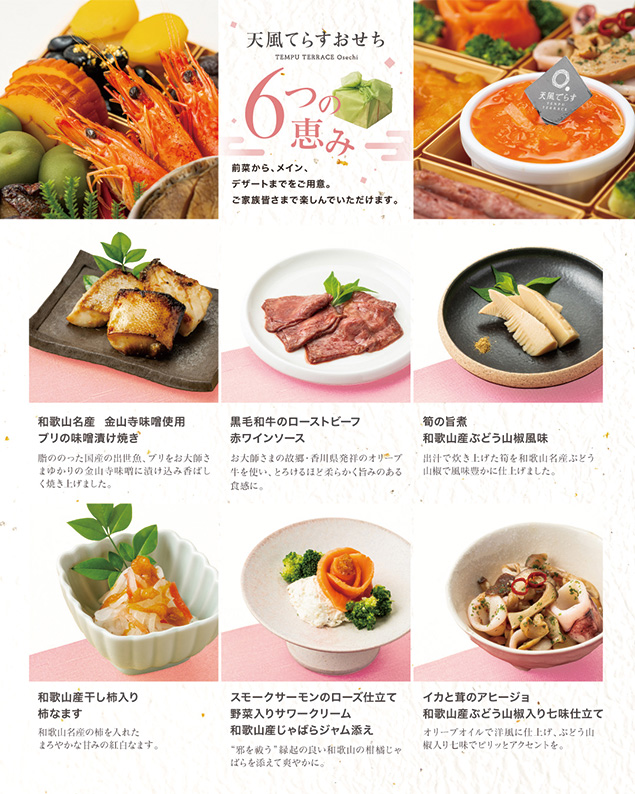 『天風てらすおせち』は、和歌山の名産品と弘法大師にまつわる食材をふんだんに使った和洋折衷の祝い膳。高野山麓で作られる「干し柿」や高野山発祥の「高野豆腐」、お大師さまが伝えたともいわれる「金山寺味噌」、そして和歌山県が全国生産量1位を誇り高野山に昔から奉納されてきた「ぶどう山椒」、邪を払うと言われる和歌山の縁起の良い柑橘「じゃばら」のジャムを添えなど、縁起の良い食材が彩り豊かに詰め込まれています。